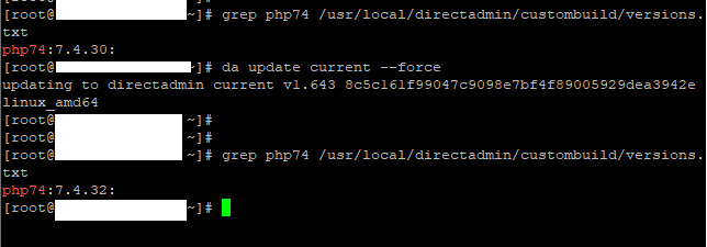 Code:grep php74 /usr/local/directadmin/custombuild/versions.txt da update current --force grep php74 /usr/local/directadmin/custombuild/versions.txt