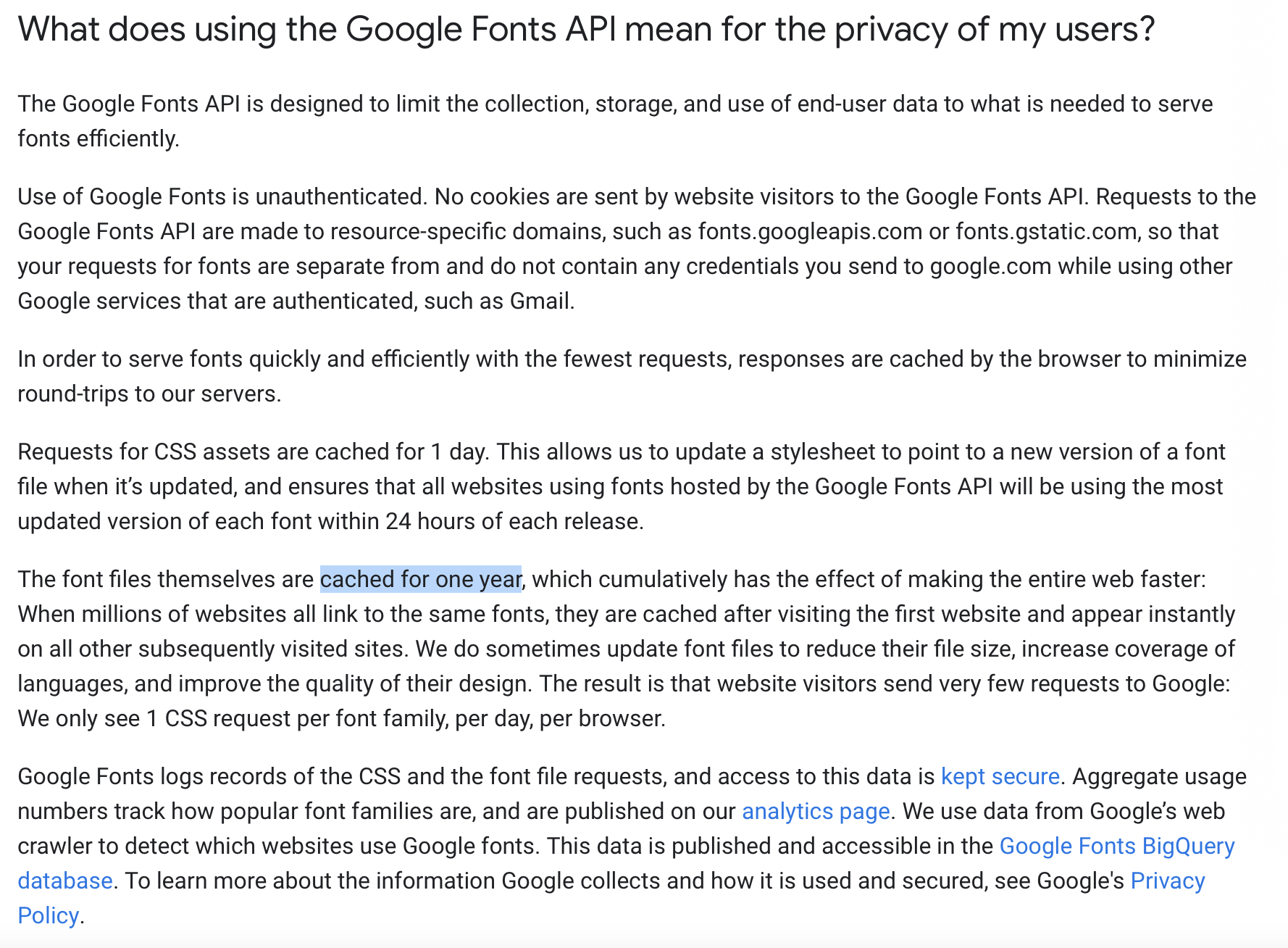 Yes it is, while you can't ever trust external that aren't from yourself upfront, and for the time using them, while one mistake somewhere with for example dns security somewhere and the scripts, files could be from a bogus server or site also later, this is real issue, no matter which scripts, fonts, whatever.The server doesn't send any cookie information or anything else, so, it's not about safety. The only information sent once in a year (because later it's cached and loaded from your browser) is IP address requesting that resource. If you've visited any other page, which loaded the same font - no requests are sent at all. And even that 1 time in a year when the visitor IP is known (as it's the end-customer requesting the resource) won't be there anymore.