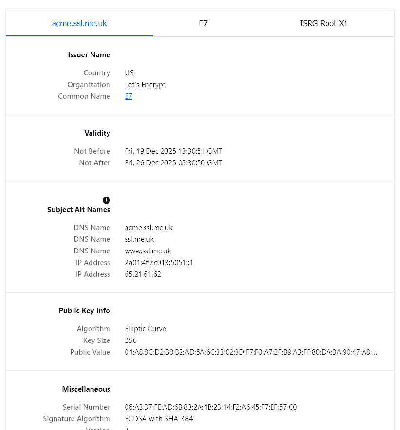 "Meuk"As I wanted to play with this yesterday, and explore it a little more @sysdev I bought a cheap domain for a few £ and spun up a vps (as illustrated above) set the hostname and put the IP cert on. Here's what the cert reports: